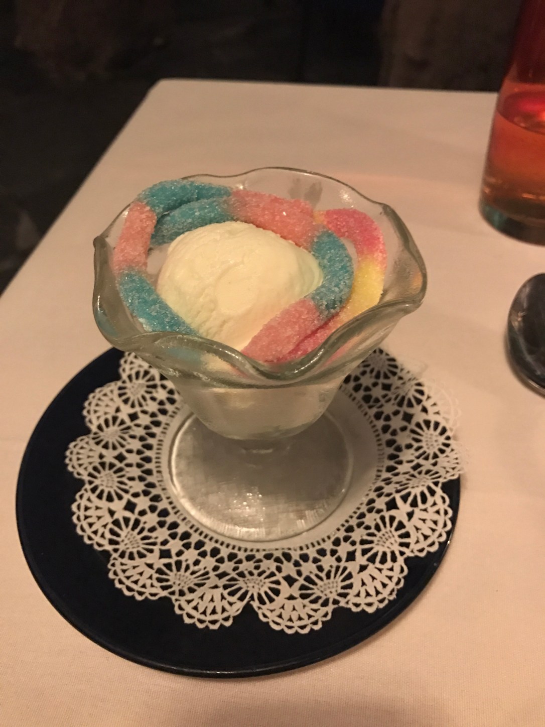 at this stage I wanted to put in my order as “all of the above” – but not wanting to appear greedy I opted for the White Chocolate cheesecake. Again, the presentaion was art on a plate and just when you thought your taste buds couldn’t take anymore excitement in one evening they did!!! It is a shame you cannot really explain flavours through words because I have to say that the accompanying spiced butternut squash sorbet was one of the most divine things I have ever tasted. I actually wanted to ask for the receipe but thought that a little bit cheeky. My son enjoyed a more simple vanilla ice-cream with Gummy-worms, and was highly amused when the waiter told him he had been outside in the mud and picked out the worms especially for him!