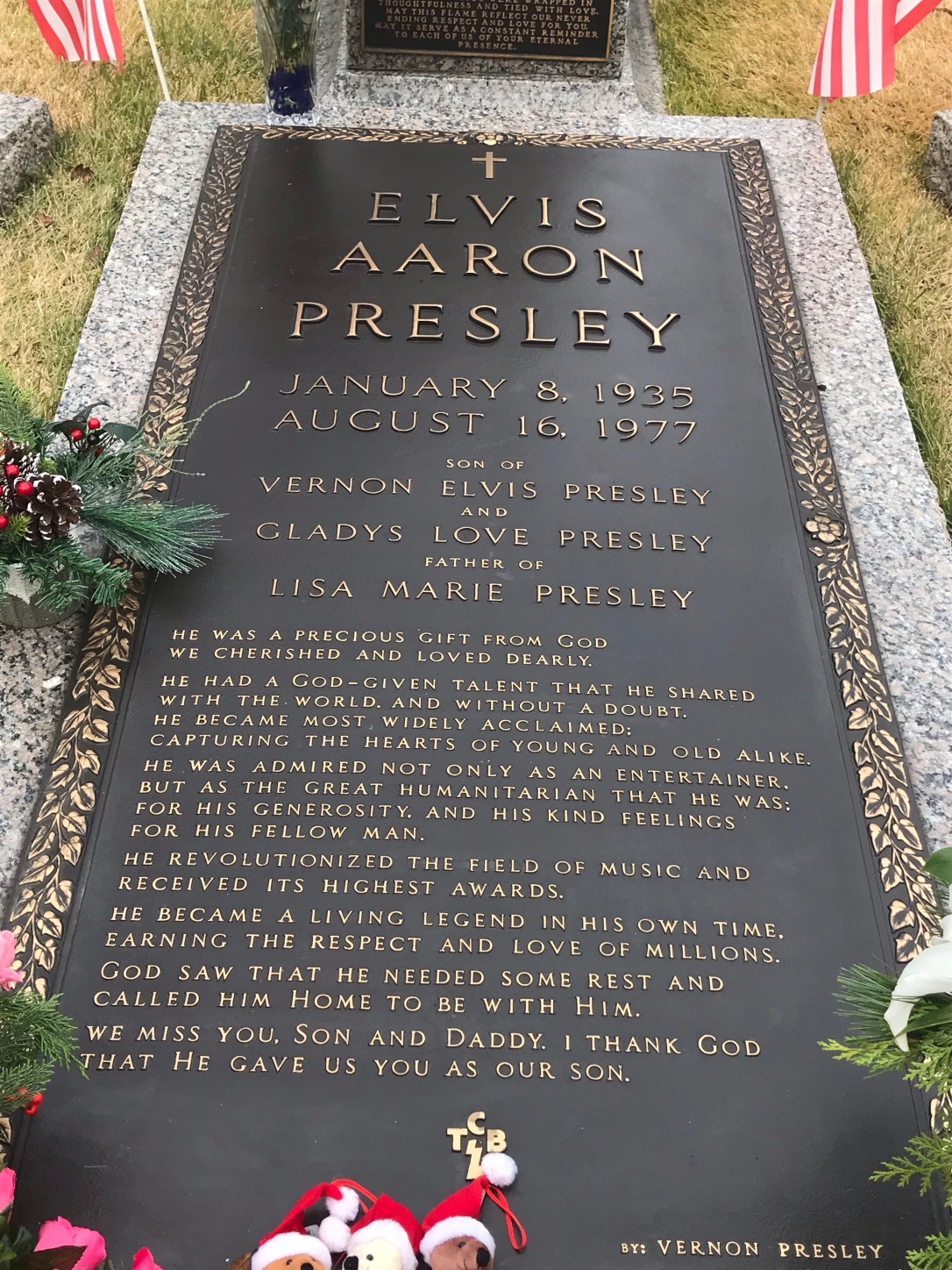 Visiting Graceland just a few days before Christmas was relatively quiet. I don’t know how busy it gets in peak tourist season but I felt grateful that we were able to look around with very few other guests there. This became particularly relevant when we went to pay respects at his grave. It was a particularly moving & poignant moment as we were there alone, just to have a private moment in that space where he is laid to rest alongside his parents and grandmother (his grandmother outliving her son, her daughter-in-law and her grandson). I don’t mind admitting that I felt a lot more emotional than I expected to. Sad to reflect on a life that was cut short so suddenly and wondering about all the songs that were never to be. Thankful too that although my Dad was born on the same date as Elvis he has now been given almost double his lifespan.