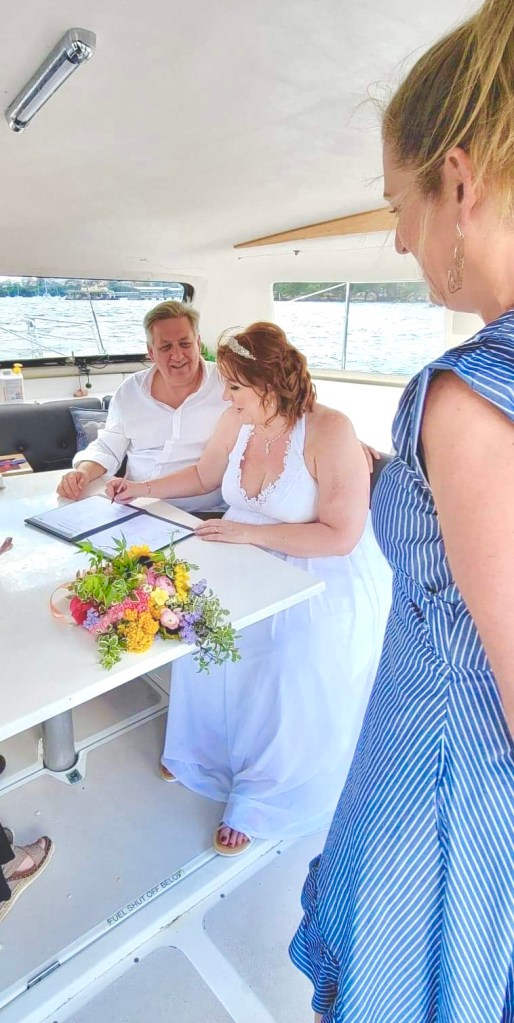 Originally Simon and I spoke about taking all 5 of our children out to Australia but after we formally became engaged 6 months later we knew that it would not only be expensive but also now be logistically impossible. Simon’s daughter suffered a serious blood clot in her leg at the age of just 19 as a result of long covid (the exact same day Gloria suffered her final stroke!). She was told she would no longer be able to be able to fly long haul, also his Dad was 95 and would not be able to make such a long journey either. It was important to us to have ALL of our immediate family with us on such a special day, we therefore decided to have a larger scale wedding ceremony at home in the U.K. with all of our friends and family, just without signing the marriage register, and then hold our legal ceremony on a much smaller scale somewhere around Sydney Harbour.